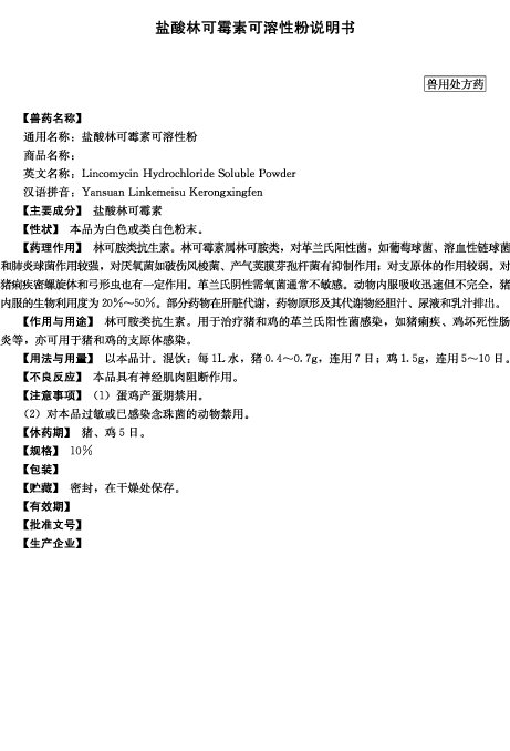 用于治療豬、雞革蘭氏陽(yáng)性菌、陰性菌引起的大腸埃希菌病、沙門(mén)氏菌病、巴氏桿菌病以及支原體引起的呼吸道疾病。