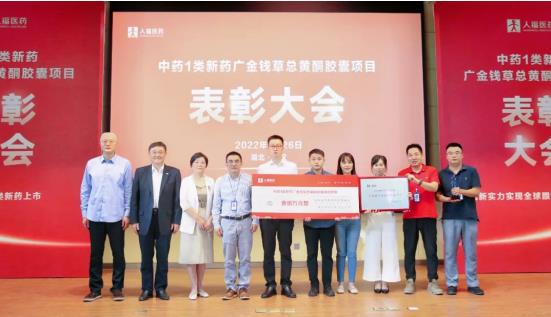 集團副總裁于群代表總裁辦宣讀《人福醫藥集團關于中藥創新藥廣金錢草總黃酮膠囊項目表彰的決定》:人福醫藥自主研發的1.2類中藥創新藥廣金錢草總黃酮膠囊獲國家藥品監督管理局上市批準,成為全球首創的防治尿結石癥中藥新藥,也是公司繼1類化藥苯磺酸瑞馬唑侖、磷丙泊酚二鈉之后,獲批的第3個1類創新藥。經集團總裁辦研究決定,授予廣金錢草總黃酮膠囊項目“研發創新獎”,對項目團隊通報表彰并獎勵人民幣100萬元。