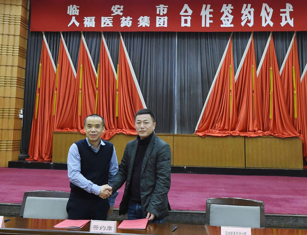 ▲人福醫藥集團副總裁劉毅代表人福醫藥與臨安市國瑞健康產業投資有限公司董事長蔣會京簽訂中醫院合作協議。