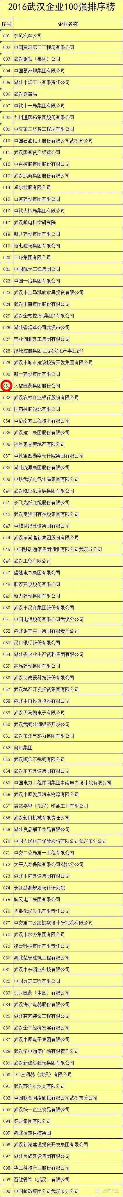 ??8月31日,2016年武漢企業100強榜單揭曉,人福醫藥集團排名第31位,較上年度排序上升7個位次。該榜單由武漢企業聯合會、武漢市工商聯、武漢企業家協會主辦,按照2015年度營業收入進行排序。