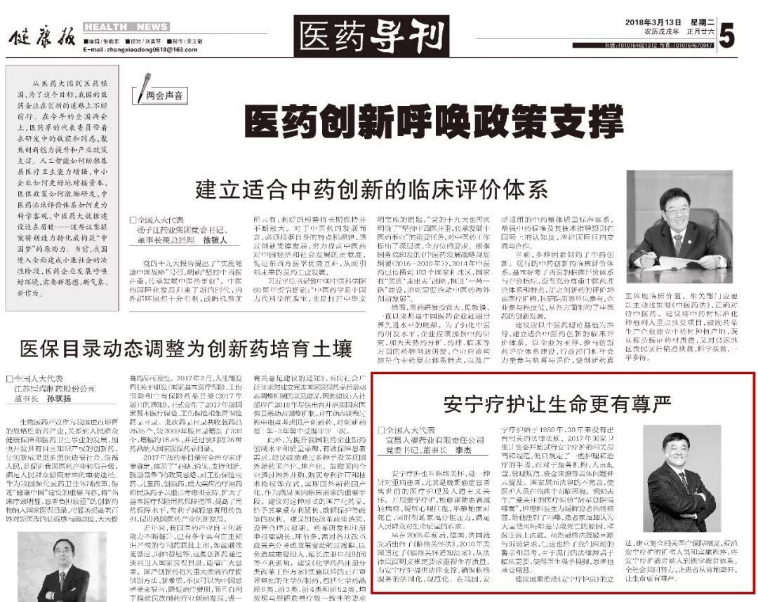 ? ? ? ?如何更好地實施臨終關懷,幫助病人減少臨終前的痛苦?全國人大代表,人福醫藥集團股份公司總裁,宜昌人福藥業有限責任公司黨委書記、董事長李杰建議推動《安寧療護法》立法,進一步規范安寧療護的標準和管理制度,幫助病人有質量有尊嚴地度過生命的最后時光。該建議受到媒體積極關注,并先后在中國新聞網、《健康報》登出。