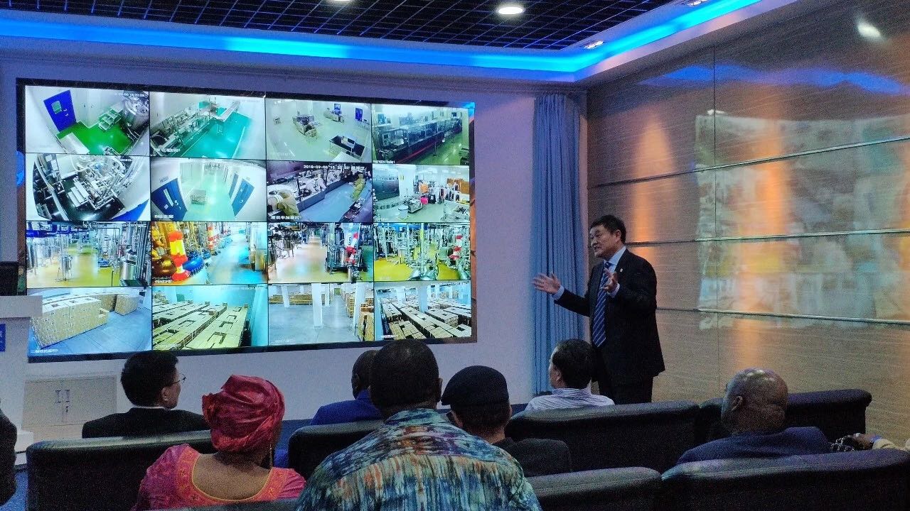 ? ? ? ? 隨后,孔戴總統(tǒng)還觀(guān)看了覆蓋廠(chǎng)區(qū)各角落、生產(chǎn)全過(guò)程的安全監(jiān)控系統(tǒng),對(duì)全自動(dòng)生產(chǎn)設(shè)備、高科技作業(yè)流程表示驚嘆。李杰總裁自豪地介紹,公司所有的高精尖設(shè)備,都是中國(guó)自主研發(fā)的,在非洲兩個(gè)工廠(chǎng)的設(shè)備也是“中國(guó)智造”。孔戴點(diǎn)頭表示贊許,并希望將來(lái)能將這些高端的技術(shù)、設(shè)備和人才引入本國(guó)。李杰董事長(zhǎng)指著全球戰(zhàn)略地圖上的幾內(nèi)亞說(shuō),希望下次再見(jiàn)總統(tǒng),這片區(qū)域的燈也亮起來(lái)了。孔戴發(fā)出爽朗的笑聲。參觀(guān)結(jié)束后,公司領(lǐng)導(dǎo)與孔戴代表團(tuán)合影留念。? ?