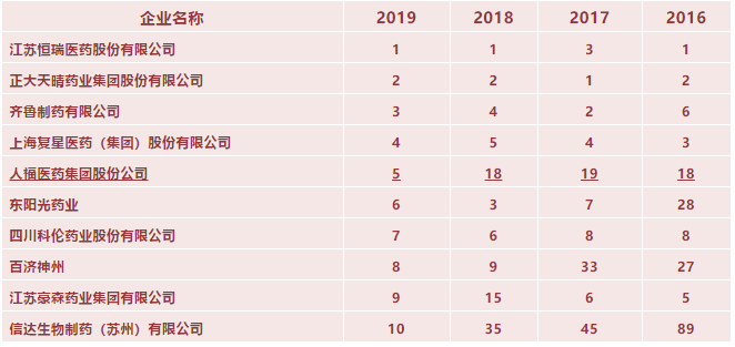 ? ? ? ? 近期,“2019中國醫藥健康產業發展大會暨第四屆中國醫藥研發?創新峰會”召開,會上隆重揭曉了《2019中國藥品研發綜合實力排行榜TOP100》,人福醫藥位列榜單第5名,較去年名次大幅提升。