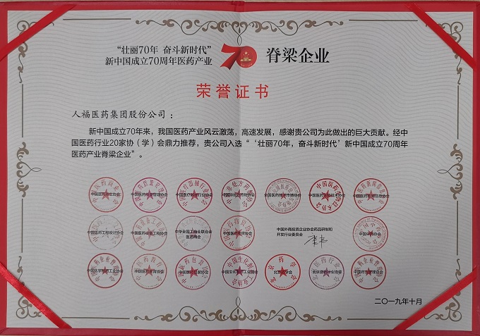 10月8日至10日,“2019中國醫藥企業家科學家投資家大會暨新中國成立70周年醫藥產業發展成就展”在北京舉行。大會同期舉行了“中國醫藥上市公司競爭力頒獎典禮”“中國醫藥創新企業100強發布”“壯麗70年,奮斗新時代”新中國醫藥70年紀念晚會、海內外醫藥創新公司投融資路演等多項活動。人福醫藥集團黨委副書記、副總裁、董事會秘書李前倫應邀代表集團參會。會上,人福醫藥集團獲“壯麗70年 奮斗新時代”新中國成立70周年醫藥產業脊梁企業、“中國醫藥創新企業100強(第19位)”兩項殊榮。