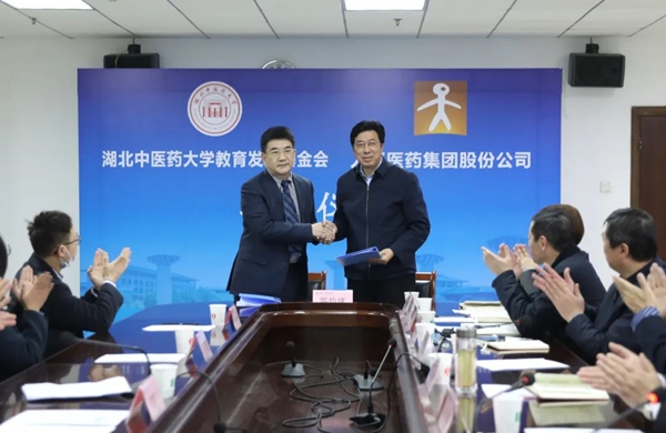 武漢人福醫療管理有限公司董事長曾志敏與湖北中醫藥大學副校長、教育發展基金會副理事長黃必勝簽訂捐贈協議
